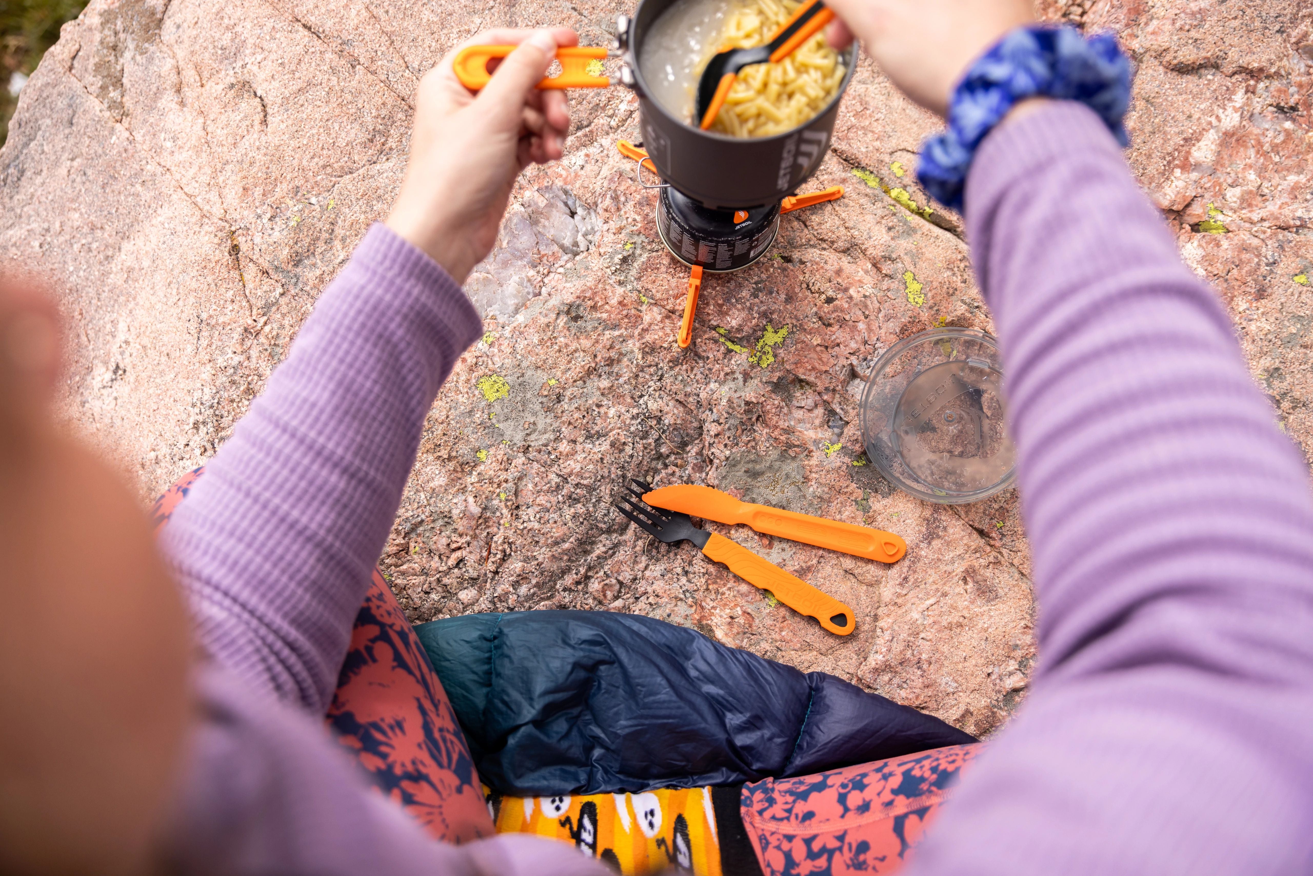 - Fork and Spoon extend to over 10" with a 3-position locking handle